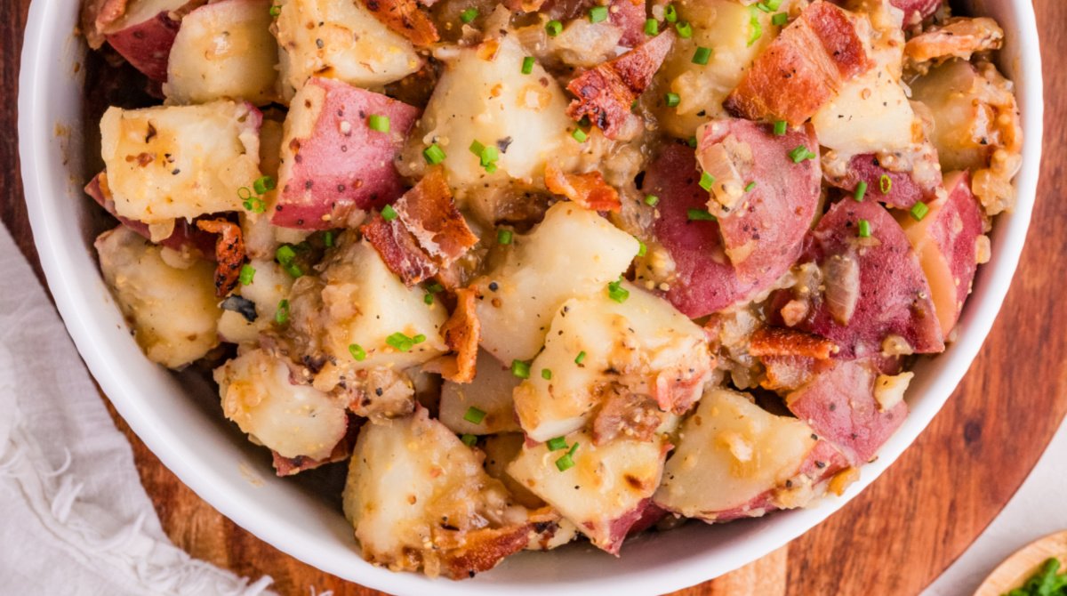 German potato salad with red potatoes, crispy bacon, and a warm vinegar dressing made with both whole grain and Dijon mustard. Serve warm or cold.