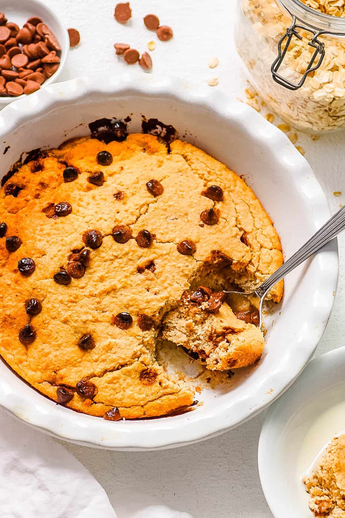 With just 8 simple ingredients, these chocolate chip baked oats are a light, fluffy, and guilt-free dessert-like breakfast.